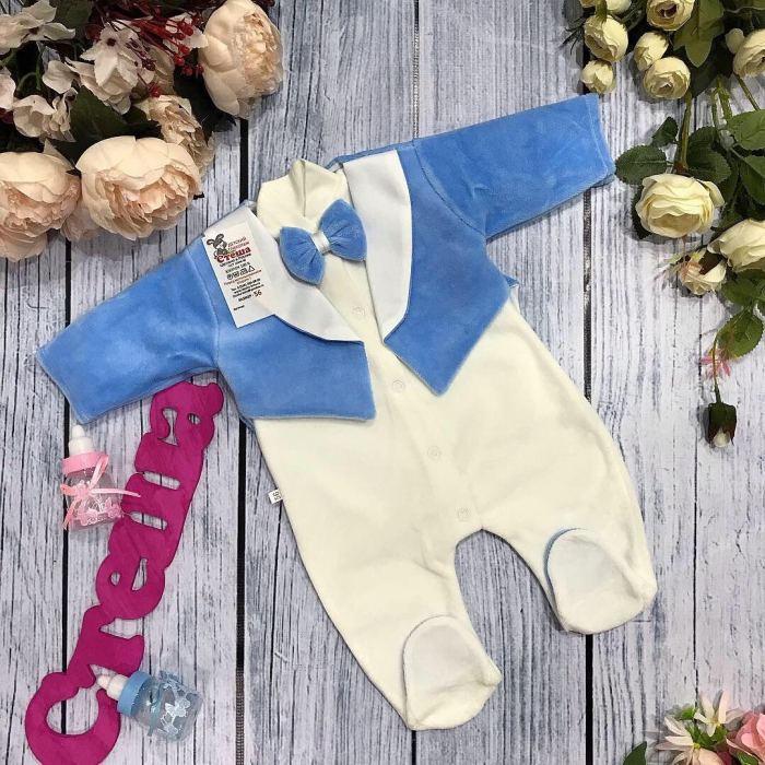 Комплект из 2-ух изделий. Комбинезон из интерлока-пенье, фрак из велюра ,украшен воротником из атласа.